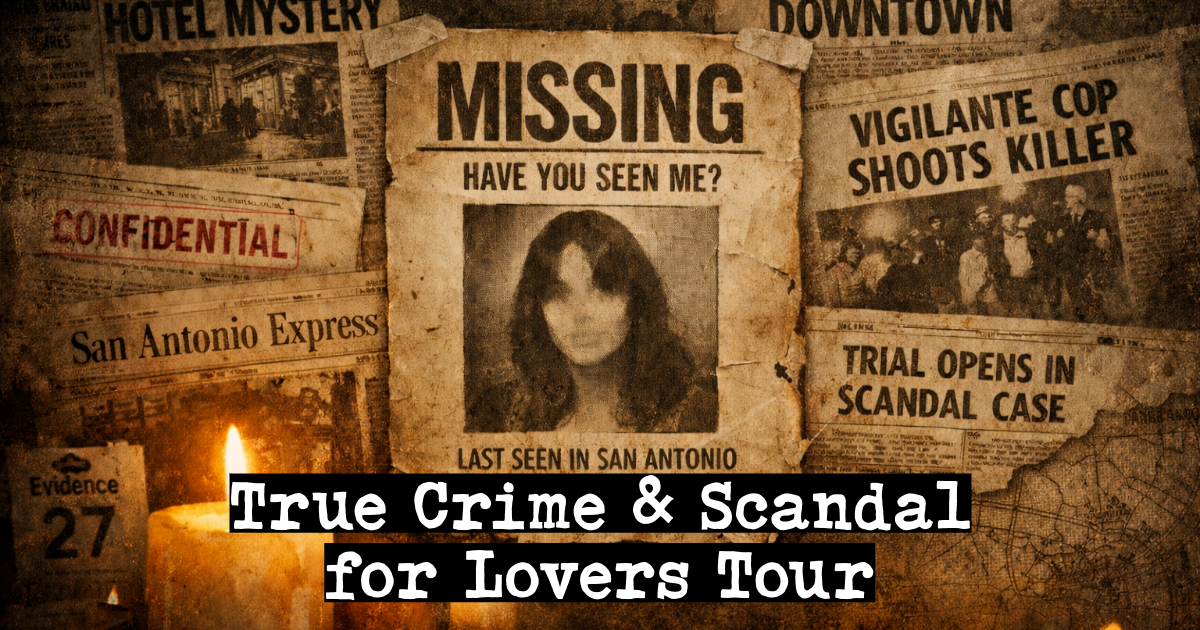 True Crime And Scandal For Lovers Tour explores real stories of murder, vice, betrayal, and obsession tied to historic homes and downtown San Antonio. The tour begins at King William Park, located at 131 King William, San Antonio, and moves north through streets shaped by wealth, power, and secrecy.
